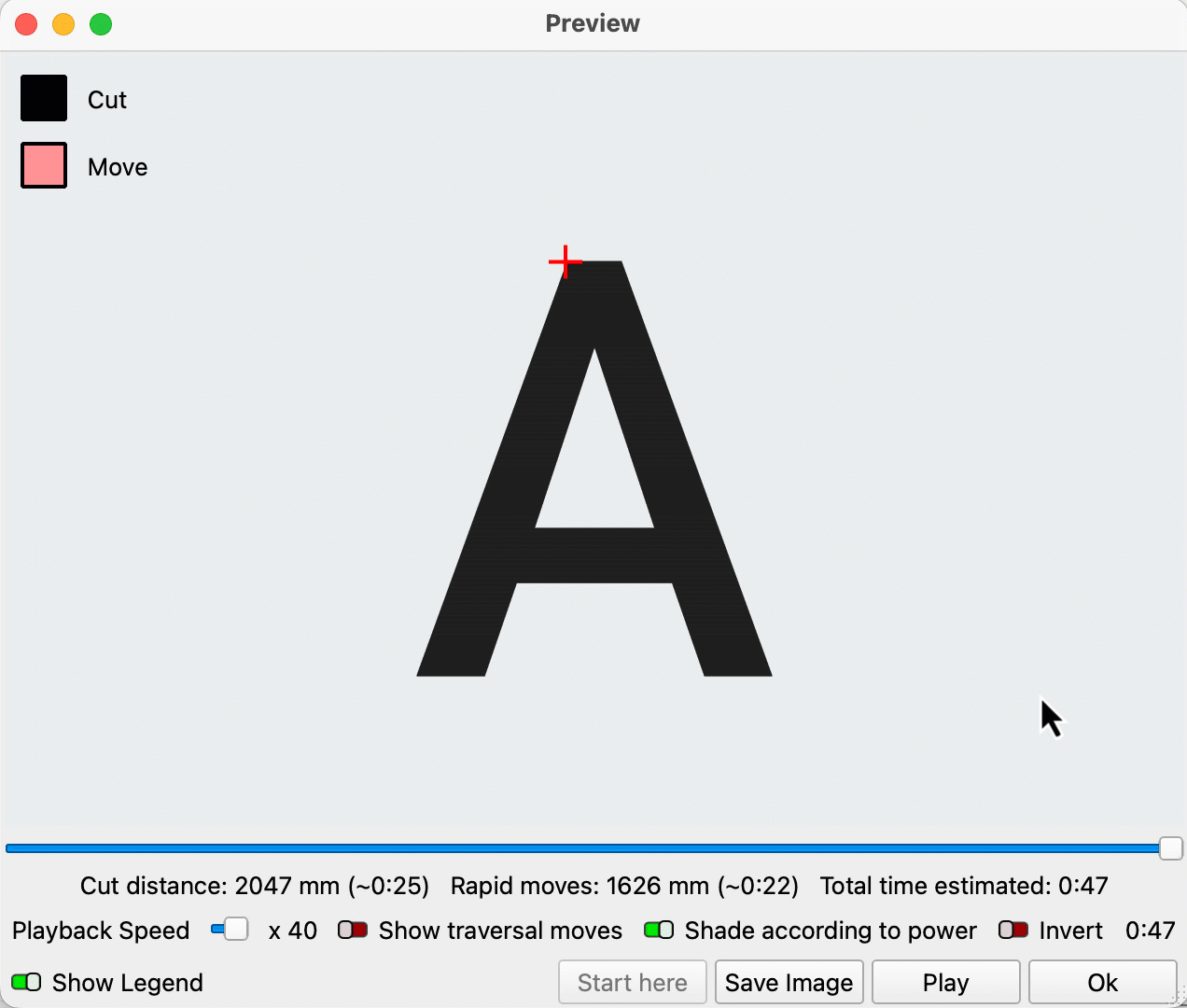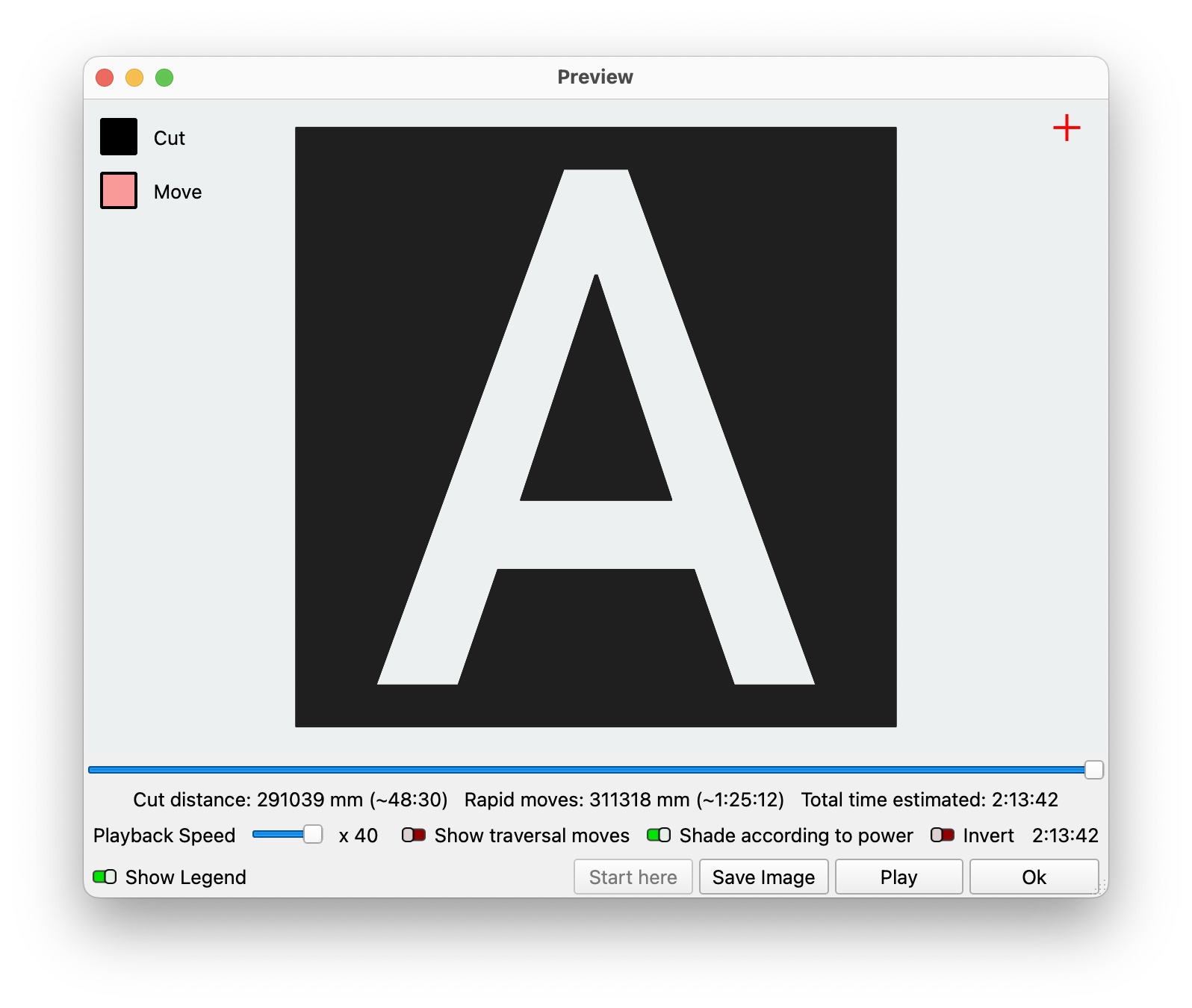 If the Invert switch is toggled on in the Preview window, engraved areas will show in white, and unengraved areas in black. This is intended to represent how your artwork will look when it's engraved on slate, granite, or another dark material upon which the laser's mark will be lighter than the original surface finish.